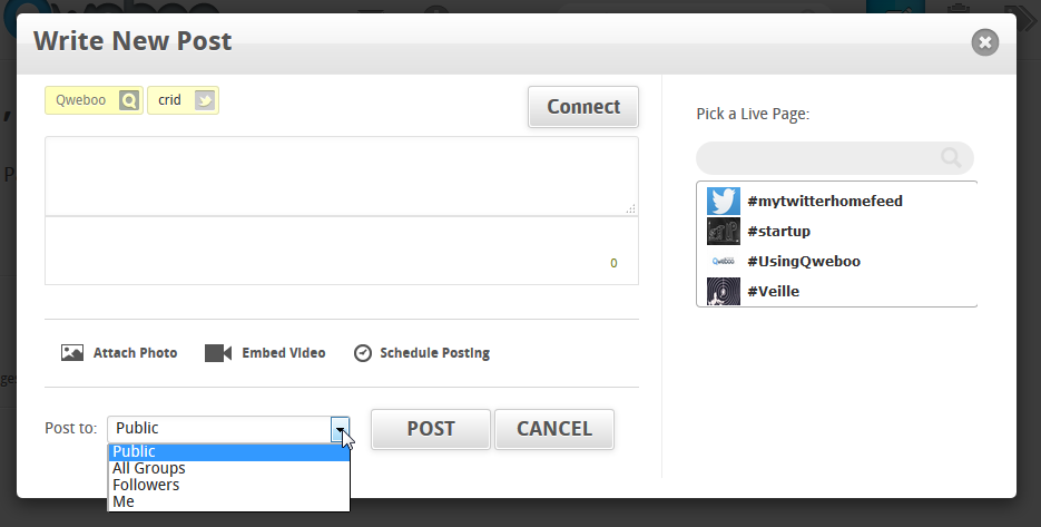 • Ecrire un post : fonctionnalité qui permet de partager un message et/ou un contenu (photo, video) sur une de vos Live page, avec vos communautés ou vos followers.