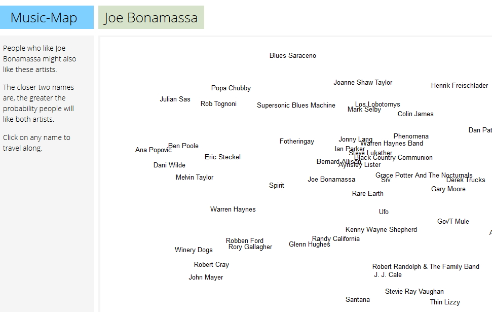 A partir du nom d’un groupe ou d’un artiste, ces services vous donnent des idées d’artistes « similaires », soit sous forme d’une liste de résultat traditionnelle soit sous celle d’une cartographie dynamique qu’on pourra continuer d’explorer par simples clics.